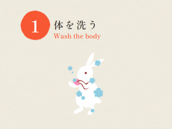 ①湯船に入る前には必ず、洗い場にて全身を洗って汚れを落とす。